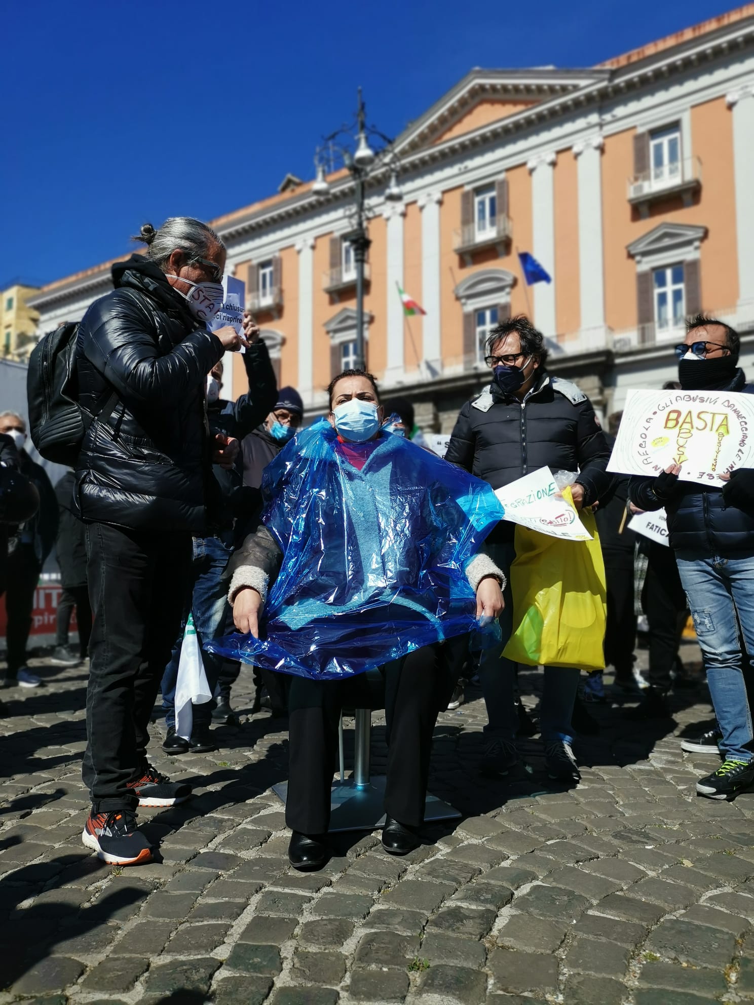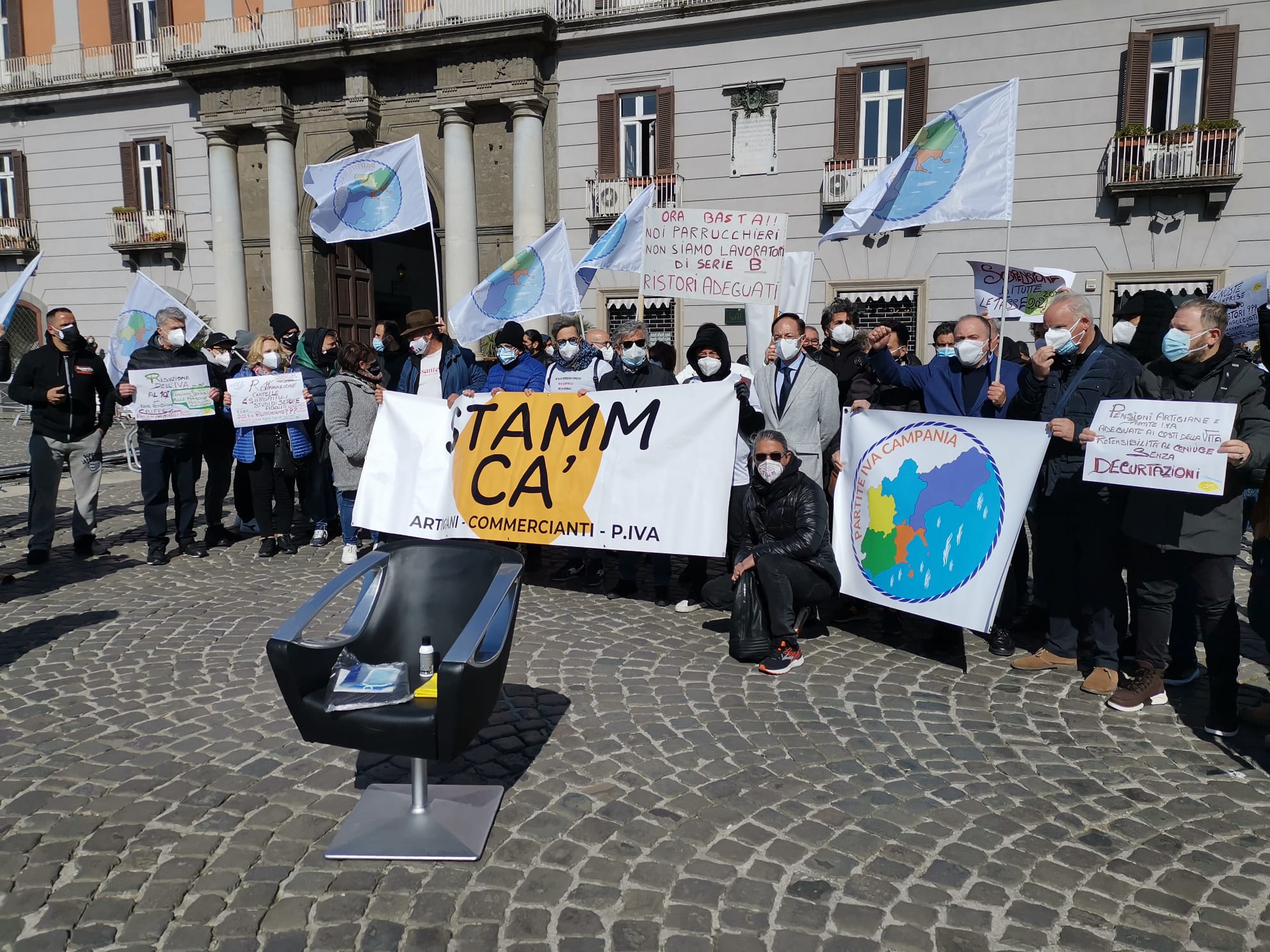 Si è tenuta questa mattina, dinanzi alla Prefettura di Napoli, la manifestazione organizzata da Confesercenti Campania per tutelare il settore “benessere e parrucchieri”, in gravissime difficoltà a causa dell’anno di pandemia. Circa mille i manifestanti della categoria “Immagine e Benessere” di Confesercenti, con la partecipazione dell’associazione “Stamm Ca” e di altri rappresentanti delle partite Iva.