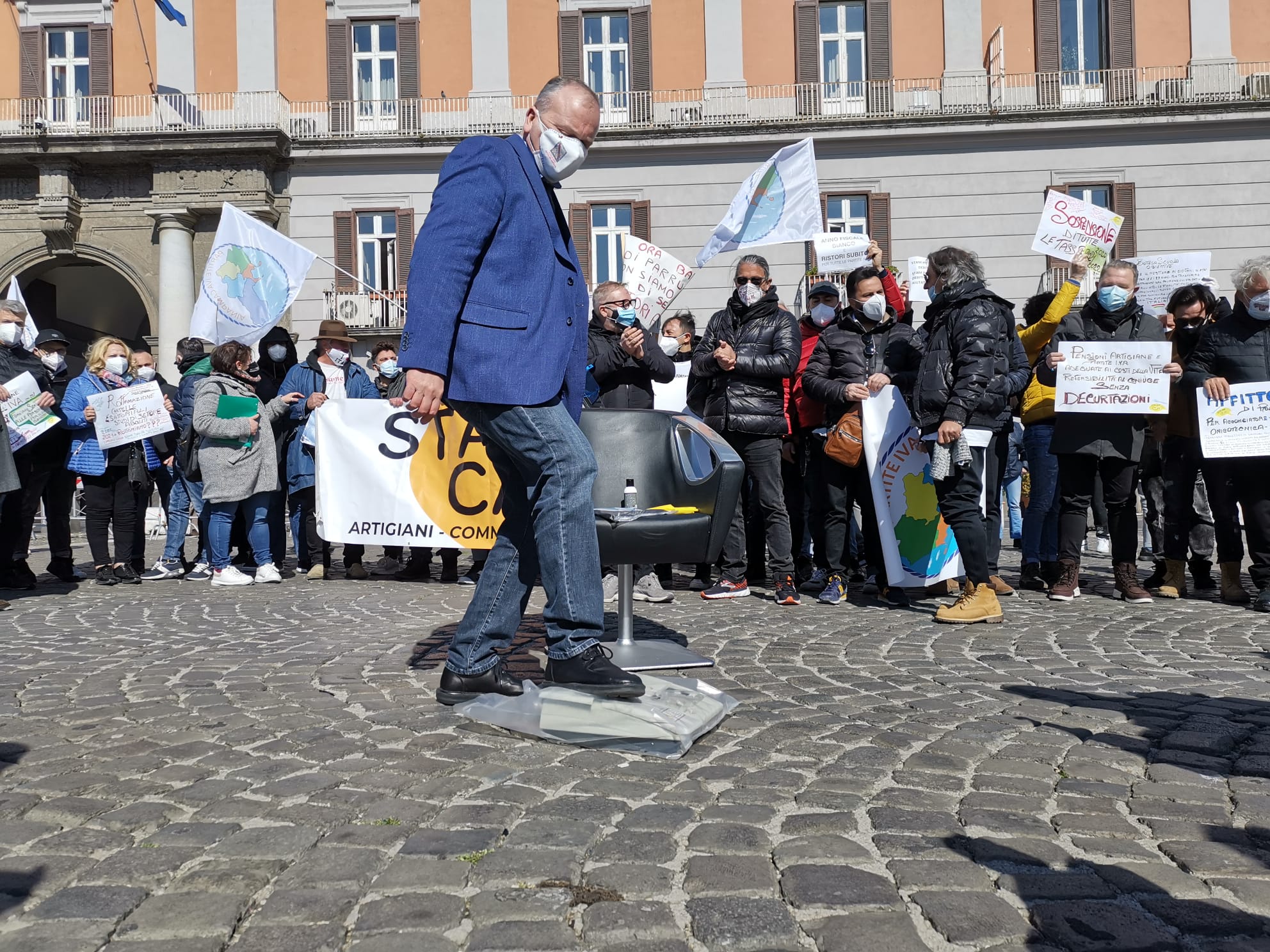 I tanti esercenti presenti hanno, simbolicamente, sistemato una poltrona da coiffeur in piazza, calpestando a turno un registratore di cassa, segno della loro impossibilità a far fronte alle spese.